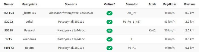 Tabela zawiera wszystkie aktualnie kursujące na danym serwerze (regionie) pociągi, wraz z informacjami o aktualnym położeniu, aktualnej prędkości oraz odległości do najbliższego semafora lub końca szlaku.