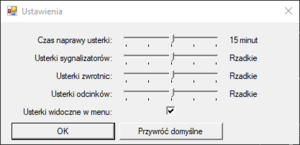 W oprogramowaniu SPE zaimplementowano symulację usterek urządzeń srk. Ich opcje dostępne są z Menu -> Usterki. (rys. 7) Sprawdzimy tam listę sprawnych oraz uszkodzonych elementów urządzeń sterowania ruchem kolejowym. Można tam zarówno uszkodzić, jak i zgłosić do naprawienia wybrany przez siebie element.