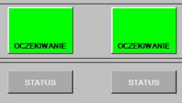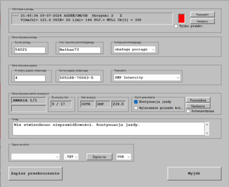 2. Okienko stanu - informuje czy w danym pociągu wystąpiły stany awaryjne (kolor czerwony) czy też nie (kolor zielony). W przypadku jeśli wystąpiły stany awaryjne i wszystkie zostały zapisane przez operatora systemu wówczas w okienku dodatkowo pojawia się symbol “X”,