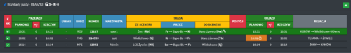 Pociągi, które skończyły bieg są zaznaczone czerwonym kolorem tła w tabelce - system automatycznie usuwa je po kilkudziesięciu sekundach.
